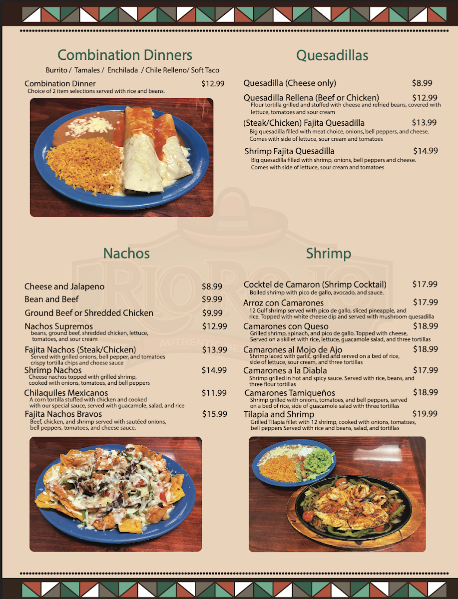 Typical offerings include favorites like shrimp and steak quesadillas, crispy chimichangas, and flavorful taco plates served with traditional sides such as Mexican rice and beans. Light bites like puffed tacos and queso dipping sauce are ideal for sharing or enjoying as a satisfying snack. Complement the meal with authentic drinks like horchata or freshly made juices, which add a refreshing touch to the warm, relaxed environment.