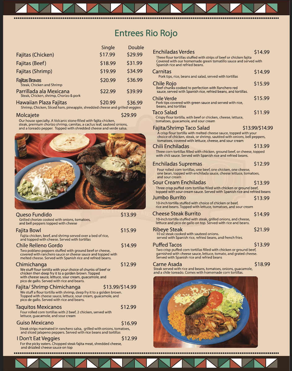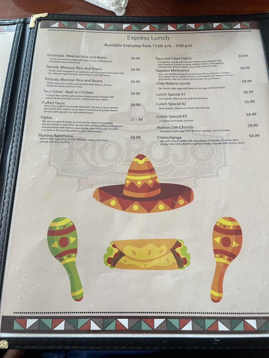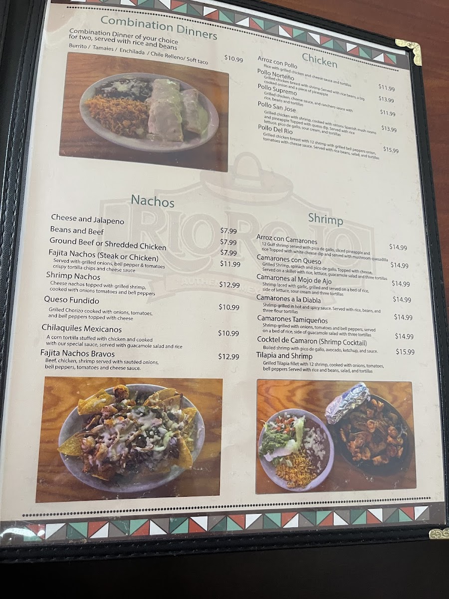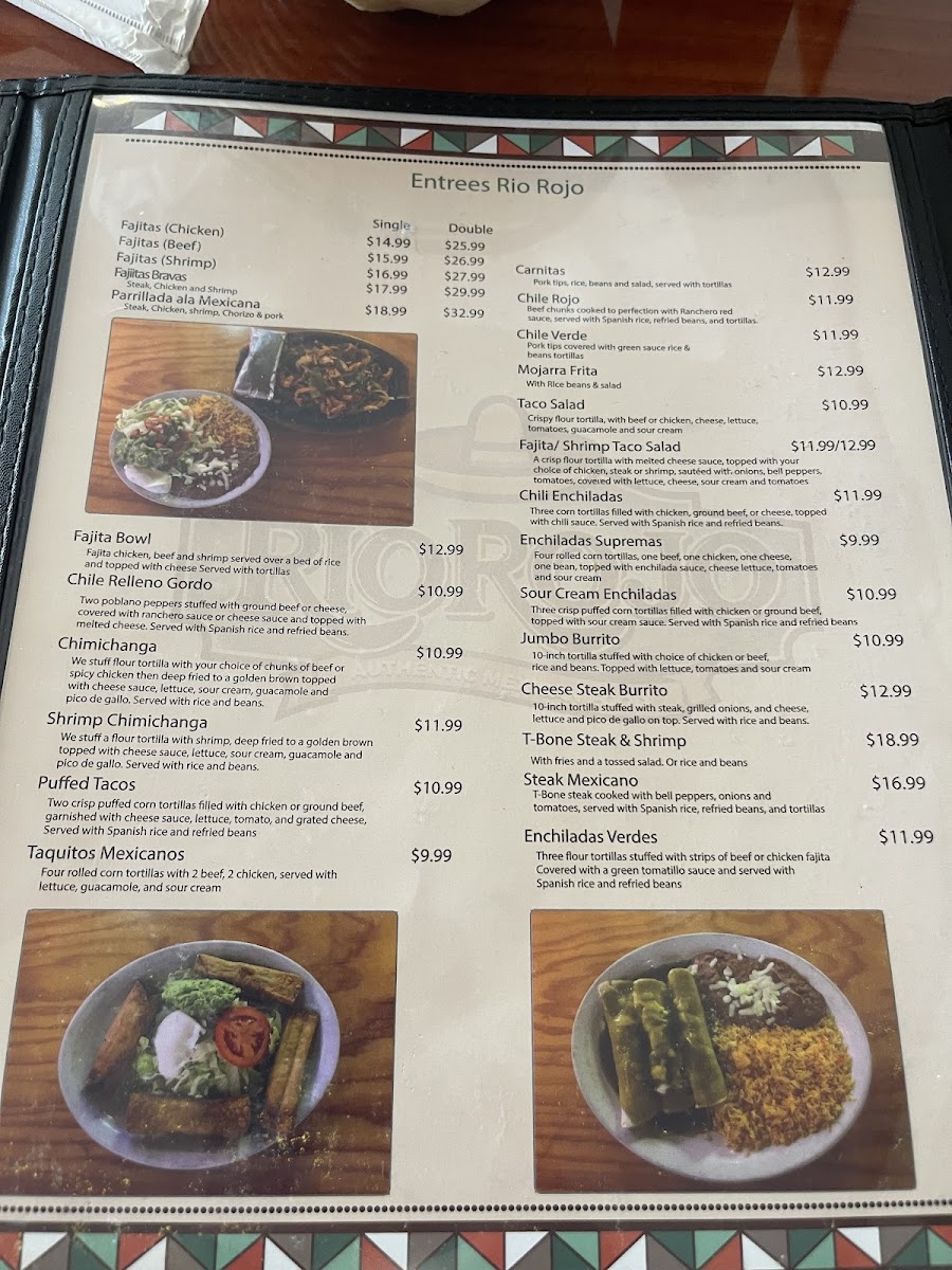 Rio Rojo Authentic Mexican Food offers a menu that feels like a welcoming, casual spot for enjoying classic Mexican dishes. The menu features comforting, flavorful meals ranging from hearty burritos and sizzling fajitas to fresh, hand-made street tacos. Whether you’re stopping by for a relaxed lunch or a laid-back dinner, you’ll find options that suit a variety of appetites and occasions.