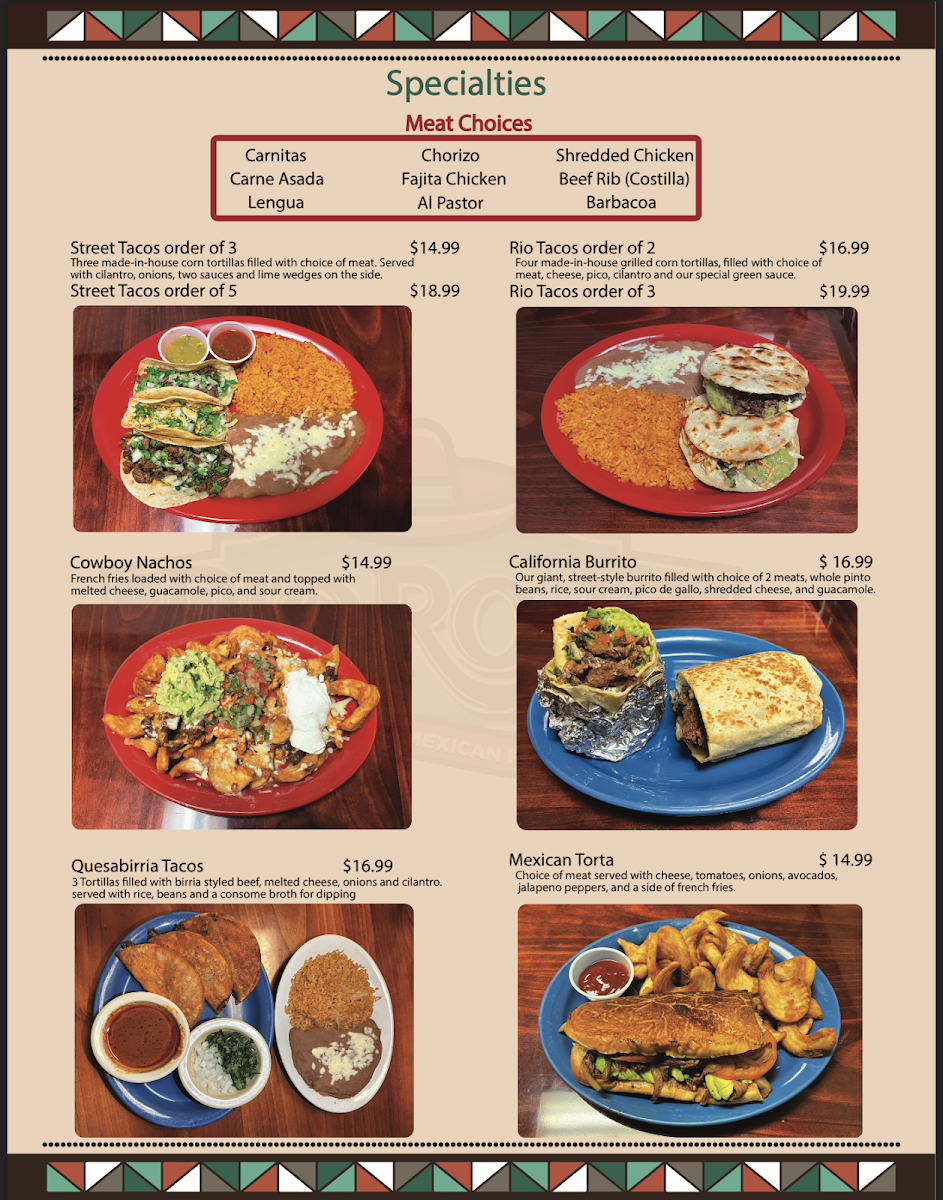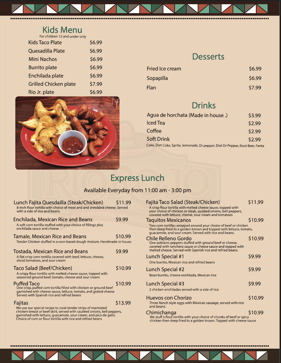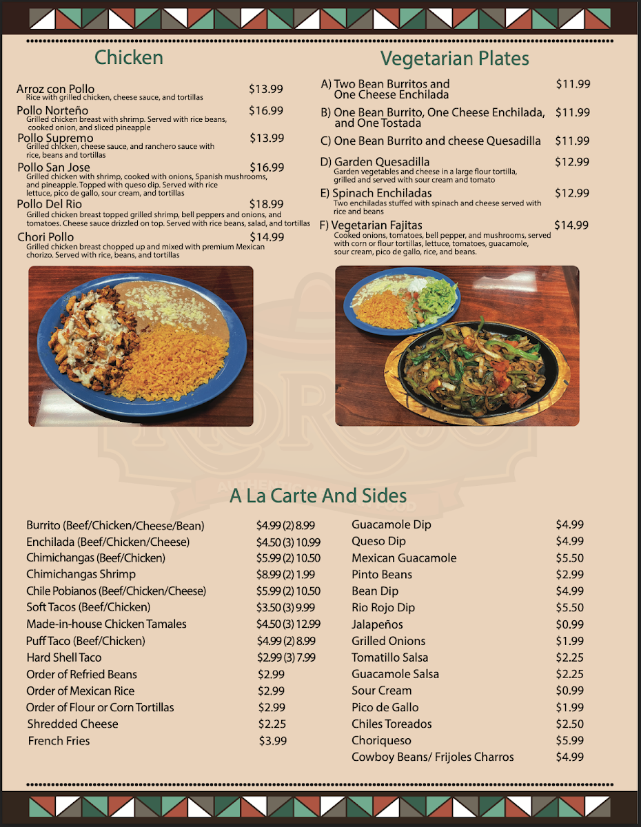 Rio Rojo Authentic Mexican Food offers a menu that feels like a welcoming, casual spot for enjoying classic Mexican dishes. The menu features comforting, flavorful meals ranging from hearty burritos and sizzling fajitas to fresh, hand-made street tacos. Whether you’re stopping by for a relaxed lunch or a laid-back dinner, you’ll find options that suit a variety of appetites and occasions.